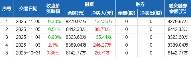 海阳科技:融资净偿还132.36万元,融资余额8279.97万元(11-06)