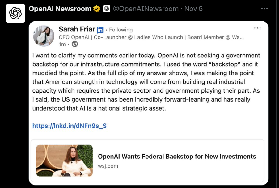 此前,OpenAI首席财务官萨拉·弗莱尔(Sarah Friar)在加州科技会议上表示,OpenAI正在“寻找一个由银行和私募股权组成的生态系统”来支持其基础设施建设,被认为是在暗示美国政府可以为OpenAI数据中心的融资进行担保。