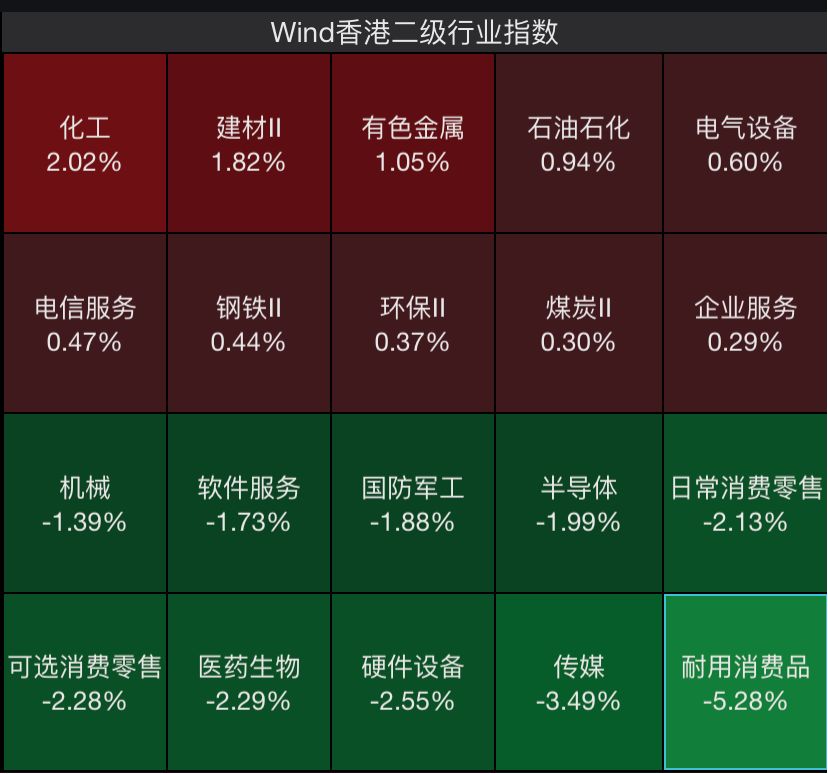 板块方面,化工、建材、石油石化、有色金属等周期类板块逆势走强,耐用消费、传媒、硬件设备、可选消费、医药生物等板块跌幅靠前。