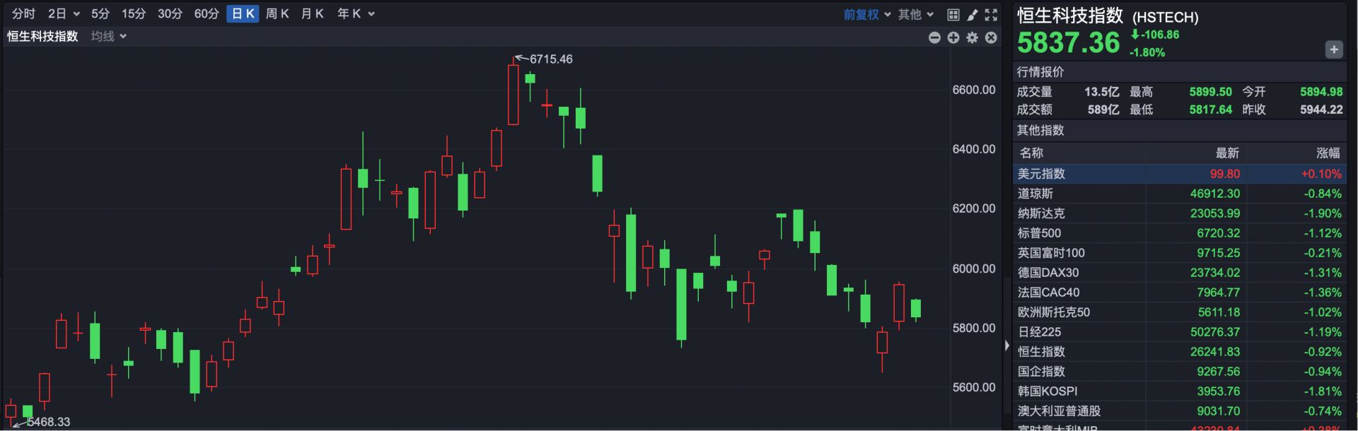 恒生科技指数报收于5837.36点,下跌106.86点,跌幅1.80%。