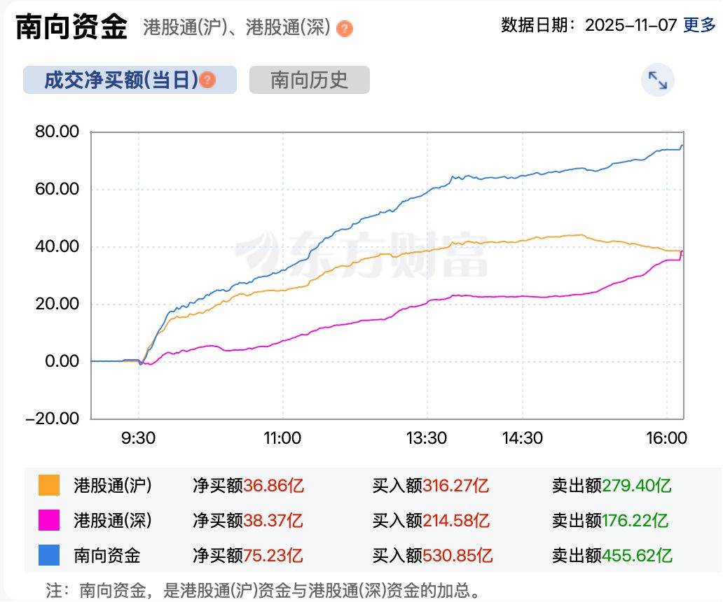 先看资金面,今日南向资金净买入港股超75亿港元。这也是自10月21日以来,连续第13个交易日净买入。
