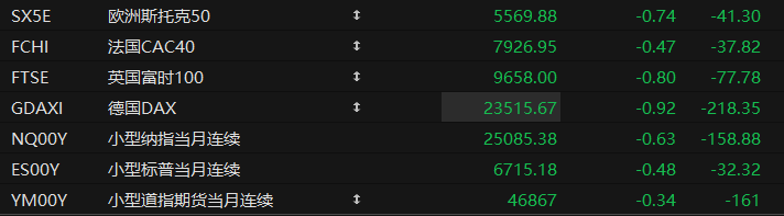 周五盘前,美股三大股指期货齐跌,欧洲主要指数普遍下跌。截至发稿,纳斯达克100指数期货跌0.63%,标普500指数期货跌0.48%,道指期货跌0.34%。
