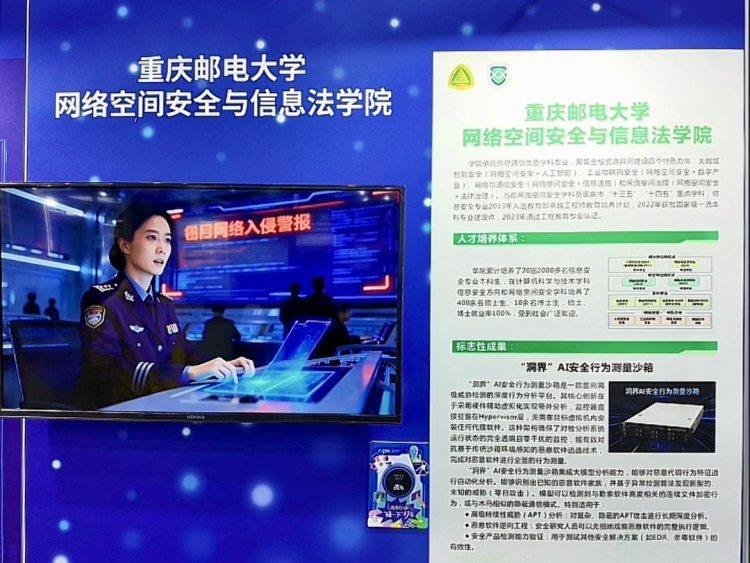 重庆邮电大学网络空间安全与信息法学院现场展示了其AI安全领域的标志性成果。