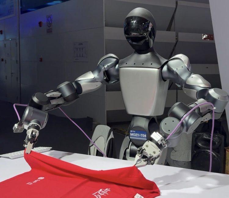 在中国移动展台,基于其九天大模型研发的多模态人工智能系统,主要用于无人厨房、政务、工业、医疗等行业场景的“AI+应用”。中国移动展台上一台正在忙着叠衣服的机器人吸引了众多参展者围观。记者看到,这台机器人的手指类似一个夹子,可以把平铺在桌台上的一件T恤衫非常熟练地叠起来。