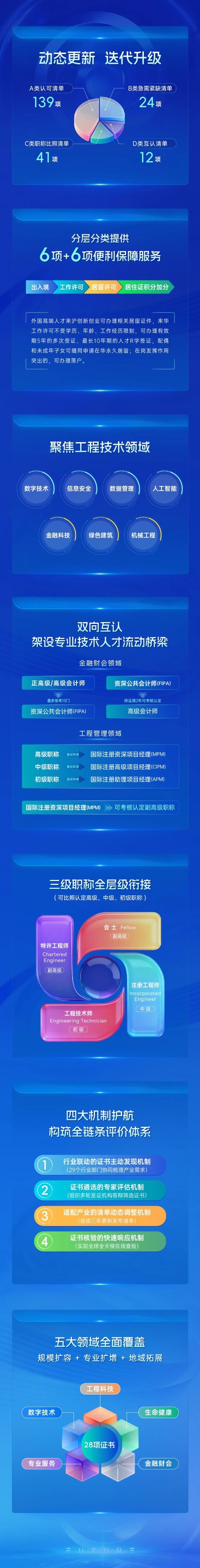 新版清单在工程科技、数字技术、生命健康、专业服务、金融财会五大领域全面扩展,新增28项国际权威证书,累计吸引909家单位1151人次申请证书查验,形成覆盖数字技术、绿色低碳等前沿领域的国际化人才评价体系。此次清单3.0版的发布,实现规模扩容、专业扩增、地域拓展,形成认可清单(A类)139项、急需紧缺清单(B类)24项、比照职称清单(C类)41项、互认清单(D类)12项。
