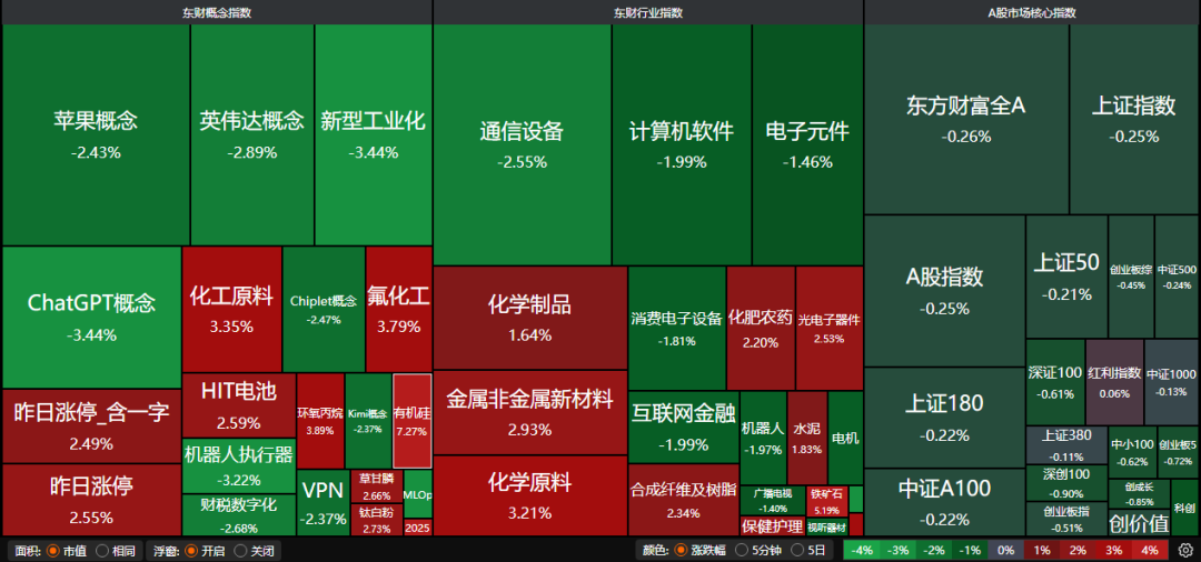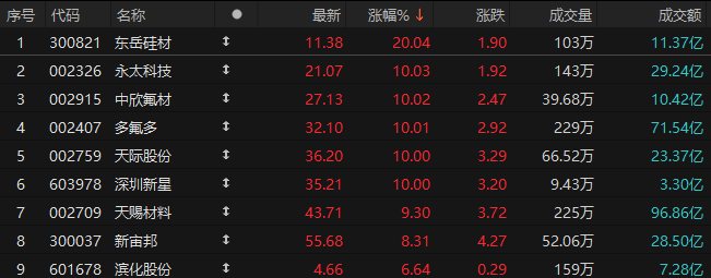 多个化工概念走强,电解液、氟化工、磷化工概念涨幅居前,此外PEEK材料、光伏玻璃、超硬材料表现较好。