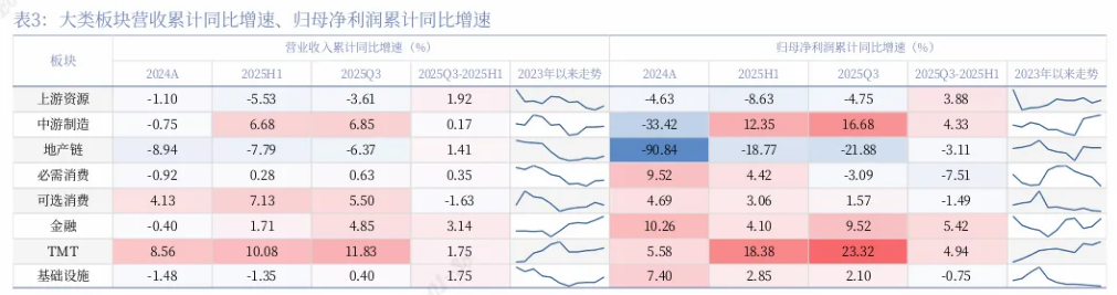 TMT板块和中游制造板块呈现出较高景气度,金融板块业绩回升。上游资源板块业绩边际改善,营收和归母净利润同比降幅均有所收窄。消费板块和基础设施板块盈利增速出现回落,其中,必需消费板块归母净利润转入负增长区间。房地产市场调整状态下,地产链业绩仍然承压。