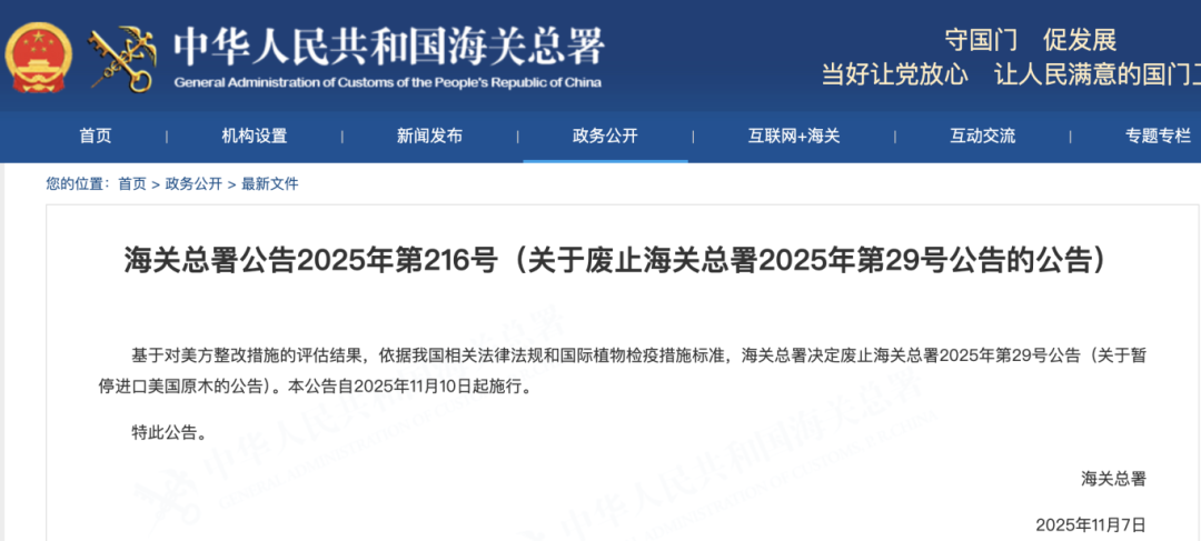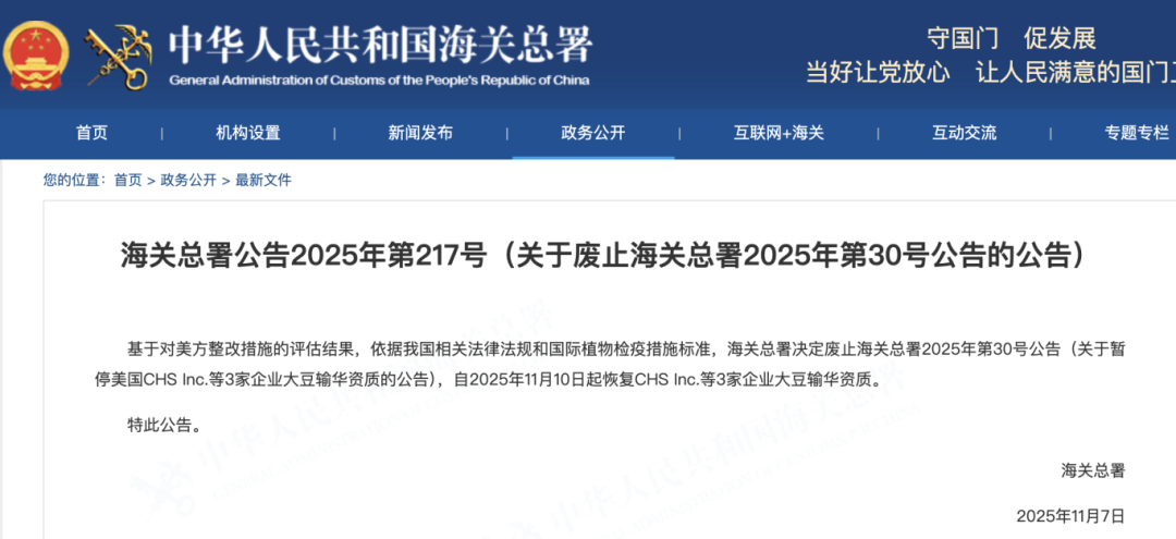 11月7日,海关总署还发布了两则公告,决定自2025年11月10日起废止海关总署2025年第29号公告(关于暂停进口美国原木的公告);自2025年11月10日起恢复CHS Inc.等3家企业大豆输华资质。