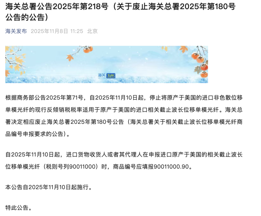 此前,商务部在11月5日发布公告称,2025年9月3日,商务部发布2025年第48号公告,自2025年9月4日起,对原产于美国的进口相关截止波长位移单模光纤实施反规避措施,将原产于美国的进口非色散位移单模光纤的现行反倾销税税率适用于原产于美国的进口相关截止波长位移单模光纤。