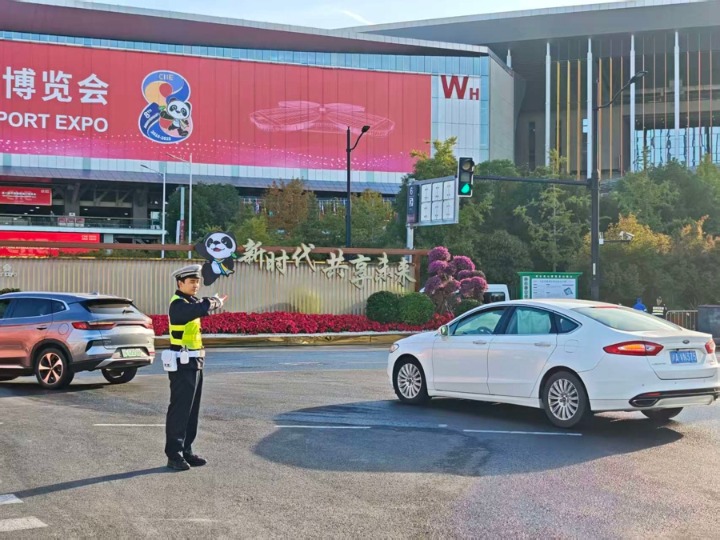 在国家会展中心周边,交管部门也划分了多个区域,在重点路段和车流汇流大的点位增派执勤警力,加强现场指挥和疏导,并部署摩托巡逻小分队开展不间断巡查。同时,依托易的PASS智能指挥系统,实现对周边交通的动态调控,有效提升道路通行效率。