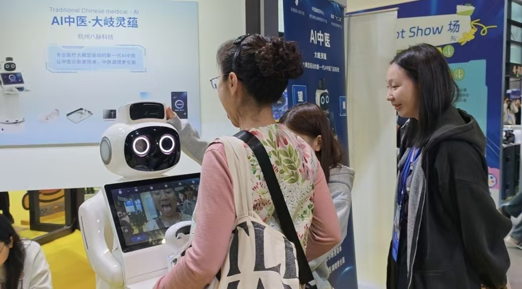由杭州八脉科技有限公司展示的“AI中医”吸引了不少参观者驻足体验。用户只需将手置于手掌大小的电极片上,再拍摄一张清晰的舌苔照片,视情况输入一些体检信息和过往病史,两分钟后,这台“AI中医”就能输出一份详实的评估报告和个性化调理建议。