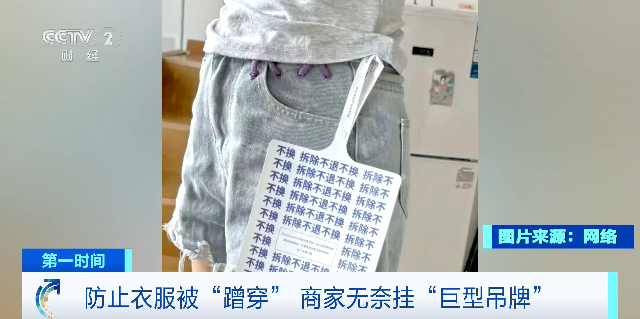 一些消费者发布的“买家秀”显示,不少商家给服装挂上了尺寸夸张的吊牌,通常有A4纸那么大。而商家的目的只有一个,就是防止有人利用7天无理由退货,只穿不买“薅羊毛”。
