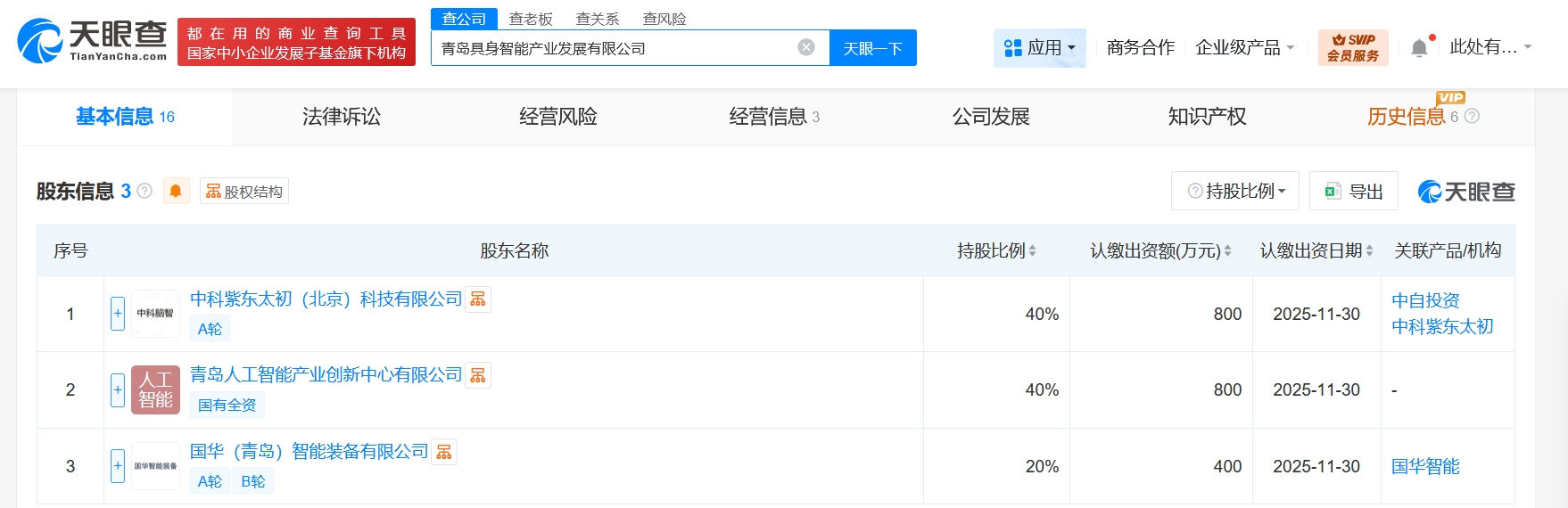 每经AI快讯,天眼查工商信息显示,近日,青岛具身智能产业发展有限公司成立,法定代表人为张云翰,注册资本2000万元人民币,经营范围含人工智能行业应用系统集成服务、人工智能公共数据平台、人工智能通用应用系统、人工智能双创服务平台、人工智能基础资源与技术平台、数据处理和存储支持服务、智能机器人的研发等。股东信息显示,该公司由中科紫东太初(北京)科技有限公司、青岛人工智能产业创新中心有限公司、国华(青岛)智能装备有限公司共同持股。