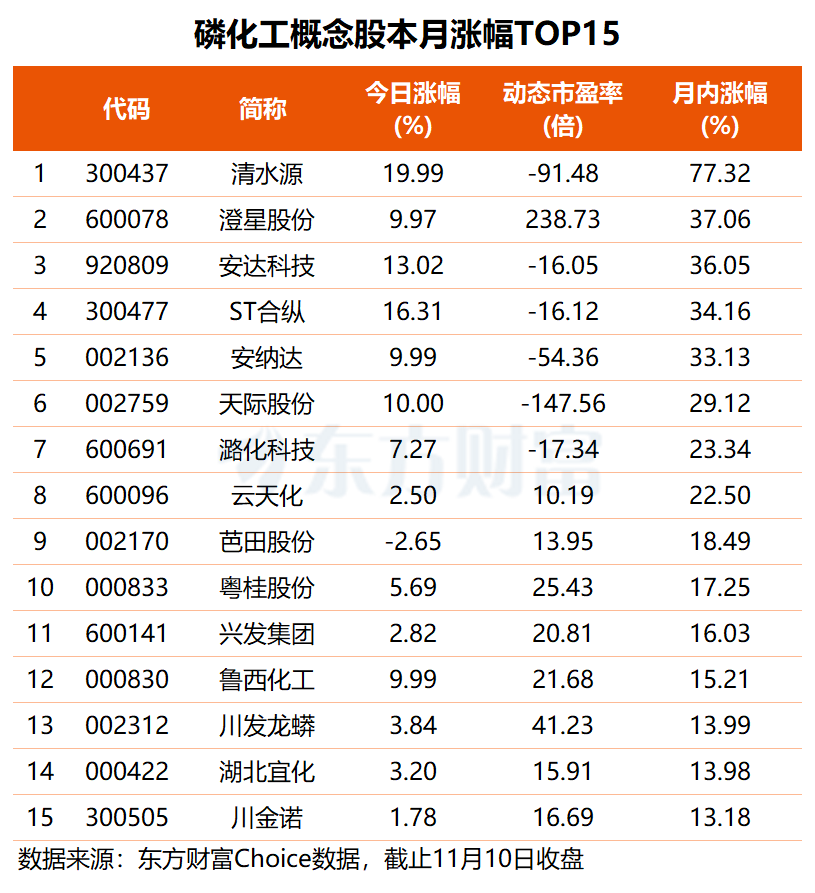 化工板块今日维持活跃,磷化工概念股再度领涨,其中,清水源尾盘封20cm涨停,ST合纵大涨超16%,天际股份、安纳达、鲁西化工、澄星股份全天几近一字涨停,雅克科技、粤桂股份等多股跟涨。