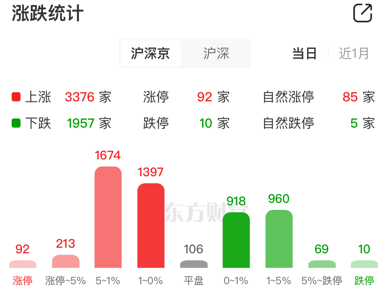 A股三大股指午后震荡回升,截至收盘,沪指涨0.53%,深成指翻红涨0.18%,盘中跌超2%的创业板指仍收跌0.92%。量能方面,两市全天成交2.17万亿元,较上一交易日放量1754亿元。全市场近3400股飘红,92股涨停,封板率为64.34%。