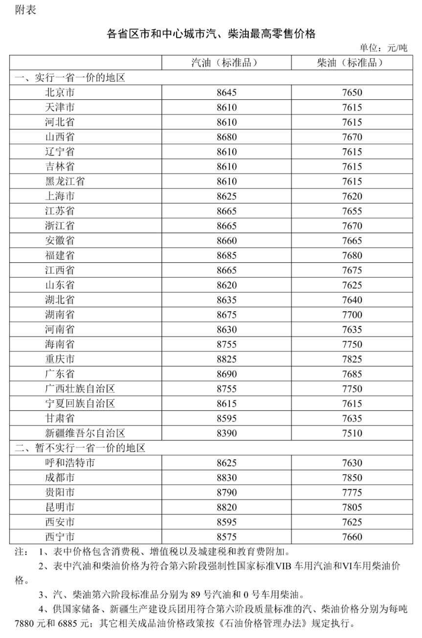 近期国际市场油价波动运行,根据11月10日的前10个工作日平均价格与10月27日的前10个工作日平均价格对比情况,按照现行成品油价格机制,自11月10日24时起,国内汽、柴油价格(标准品,下同)每吨分别上涨125元和120元。调整后,各省(区、市)和中心城市汽、柴油最高零售价格见附表。