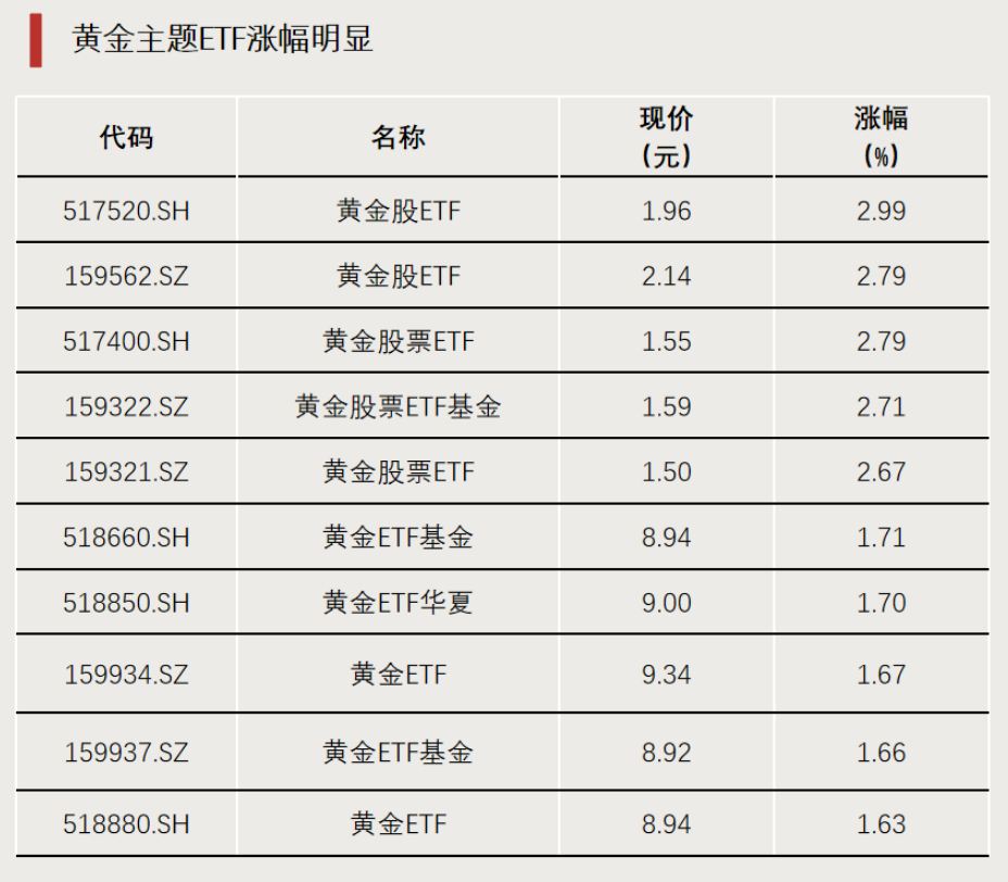 黄金主题ETF涨幅明显