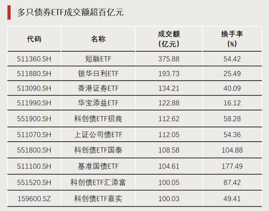 Wind数据显示,短融ETF(511360)单日成交额超300亿元,科创债ETF国泰(551800)、基准国债ETF(511100)两只ETF成交额超100亿元,且换手率均超100%。