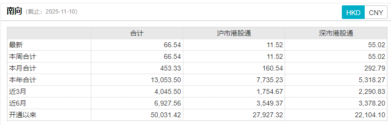 11月10日,南向资金通过港股通净流入港股市场66.54亿港元,使得年内净买入额突破1.3万亿港元,自港股通开通以来的累计净流入规模也突破5万亿港元,刷新互联互通机制开通以来的最高纪录。