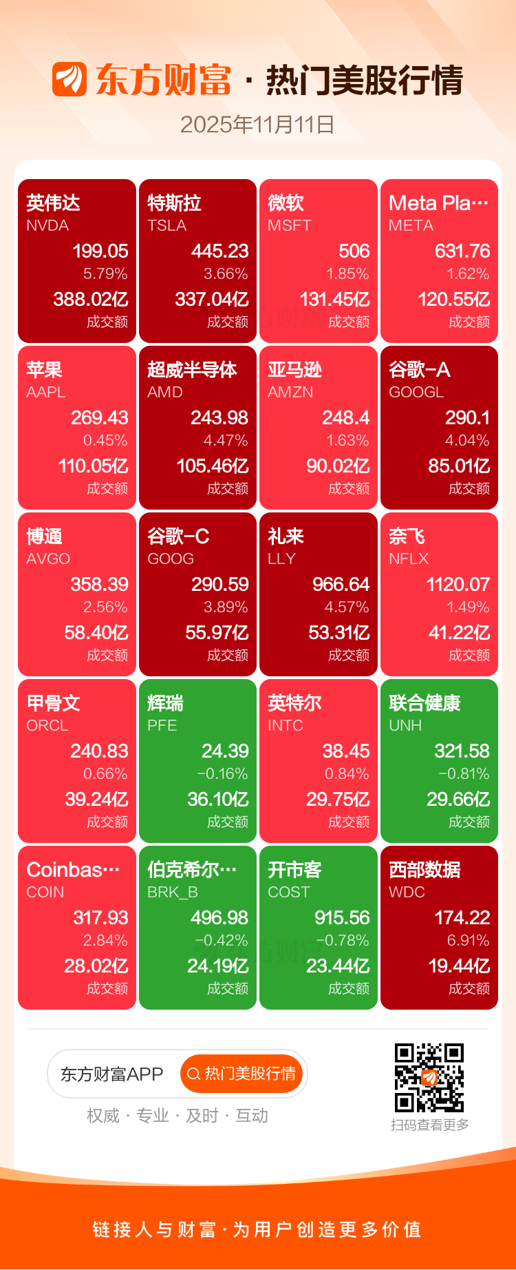 英伟达涨5.79%,特斯拉涨3.66%,微软涨1.85%,Meta Platforms Inc-A涨1.62%,苹果涨0.45%,超威半导体涨4.47%,亚马逊涨1.63%,谷歌-A涨4.04%,博通涨2.56%,谷歌-C涨3.89%。