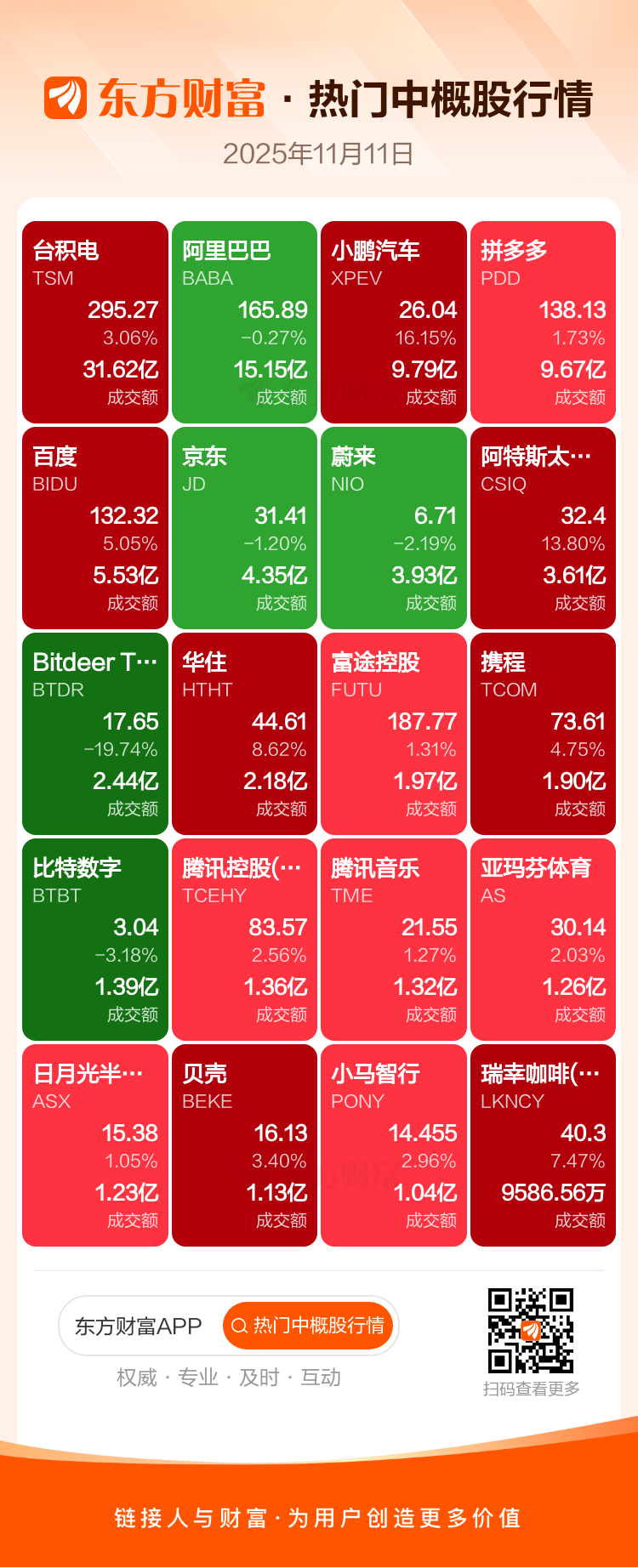 台积电涨3.06%,阿里巴巴跌0.27%,小鹏汽车涨16.15%,拼多多涨1.73%,百度涨5.05%,京东跌1.20%,蔚来跌2.19%,阿特斯太阳能涨13.80%,Bitdeer Technologies Group-A跌19.74%,华住涨8.62%。