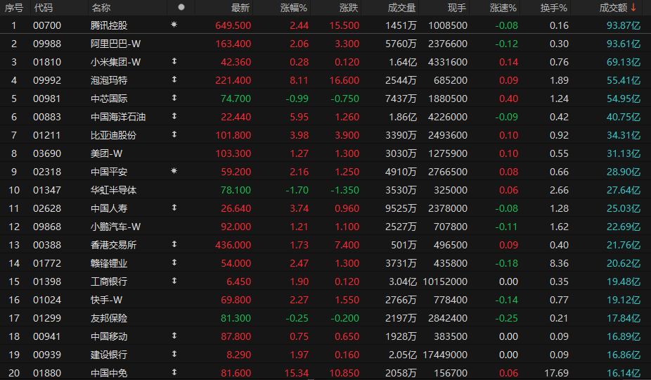 港股成交额前二十