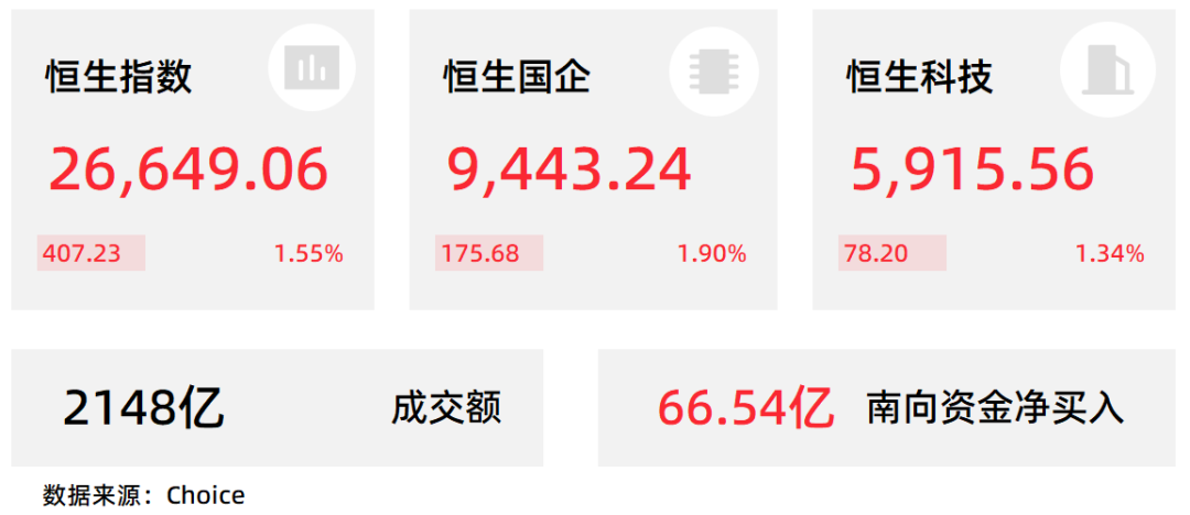 截止收盘,恒生指数涨1.55%上扬超400点报26649点,国企指数、恒生科技指数分别上涨1.9%及1.34%。