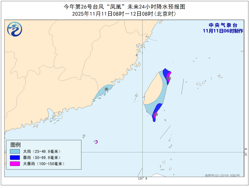 降水预报:11日08时到12日08时,福建东南部、台湾岛东部和南部将有大到暴雨,其中台湾岛东北部和东南部地区有大暴雨(100-150毫米)。