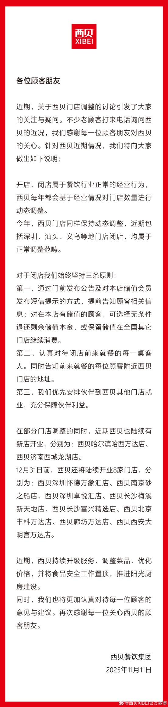11月11日,西贝发布声明,回应关于门店调整相关讨论。西贝表示,开店、闭店属于餐饮行业正常的经营行为。西贝每年都会基于经营情况对门店数量进行动态调整。今年,西贝门店同样保持动态调整,近期包括深圳、汕头、义乌等地门店闭店,均属于正常调整范畴。