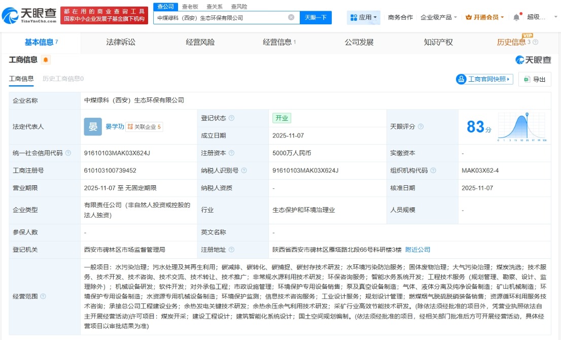 每经AI快讯,天眼查App显示,近日,中煤绿科(西安)生态环保有限公司成立,法定代表人为晏学功,注册资本5000万元人民币,经营范围包括水污染治理,污水处理及其再生利用,碳减排、碳转化、碳捕捉、碳封存技术研发等。股权全景穿透图显示,该公司由中煤西安设计工程有限责任公司全资持股,后者为中国中煤能源集团有限公司全资子公司。