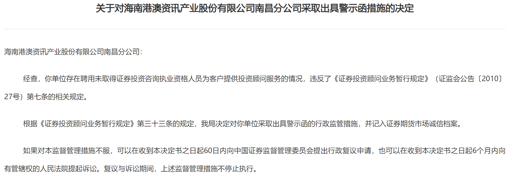 11月10日,中国证监会江西监管局发布《关于对海南港澳资讯产业股份有限公司南昌分公司采取出具警示函措施的决定》。