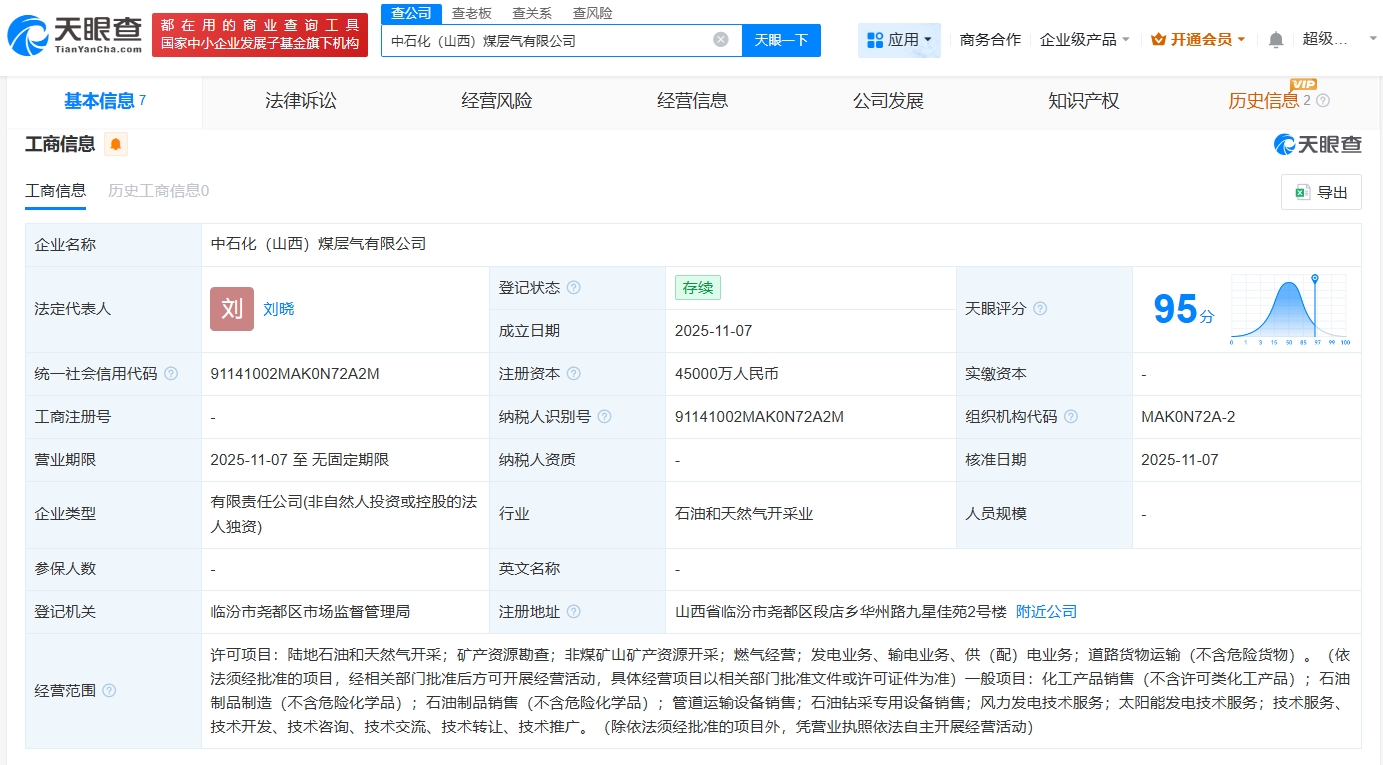 南方财经11月11日电,天眼查工商信息显示,近日,中石化(山西)煤层气有限公司成立,法定代表人为刘晓,注册资本4.5亿人民币,经营范围包括陆地石油和天然气开采、矿产资源勘查、非煤矿山矿产资源开采、燃气经营等。股东信息显示,该公司由中国石化(600028)全资持股。