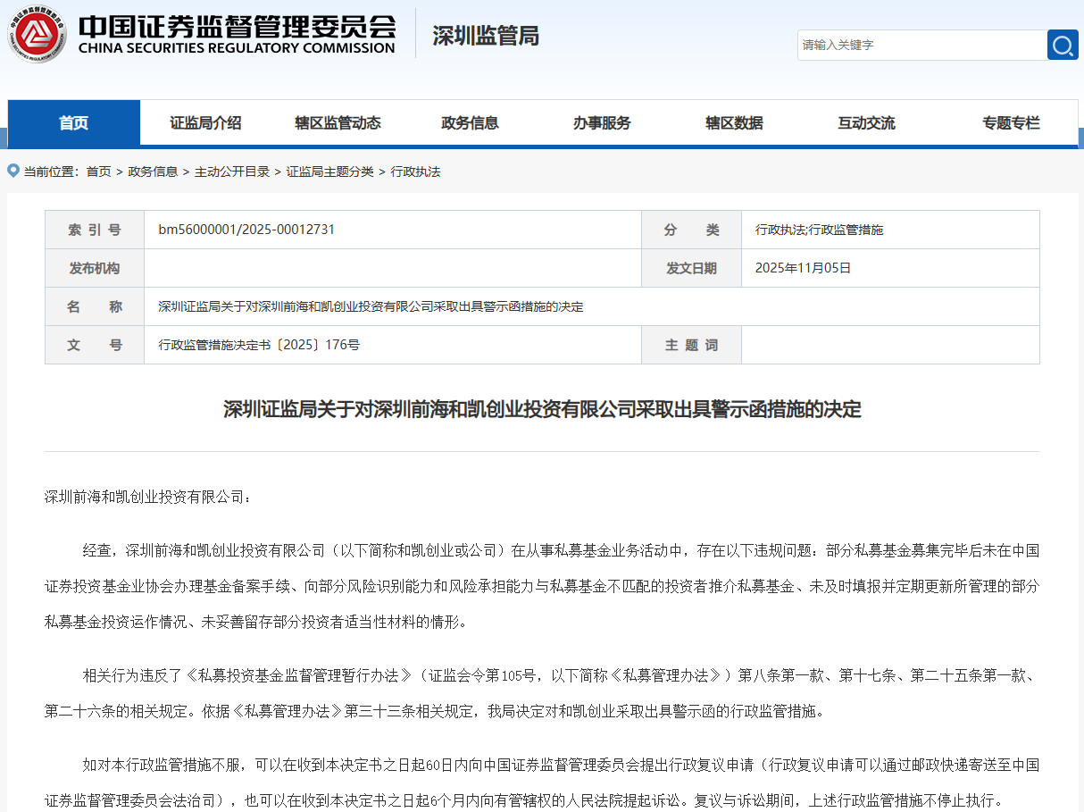 依据《私募管理办法》第三十三条相关规定,深圳证监局决定对和凯创业采取出具警示函的行政监管措施。
