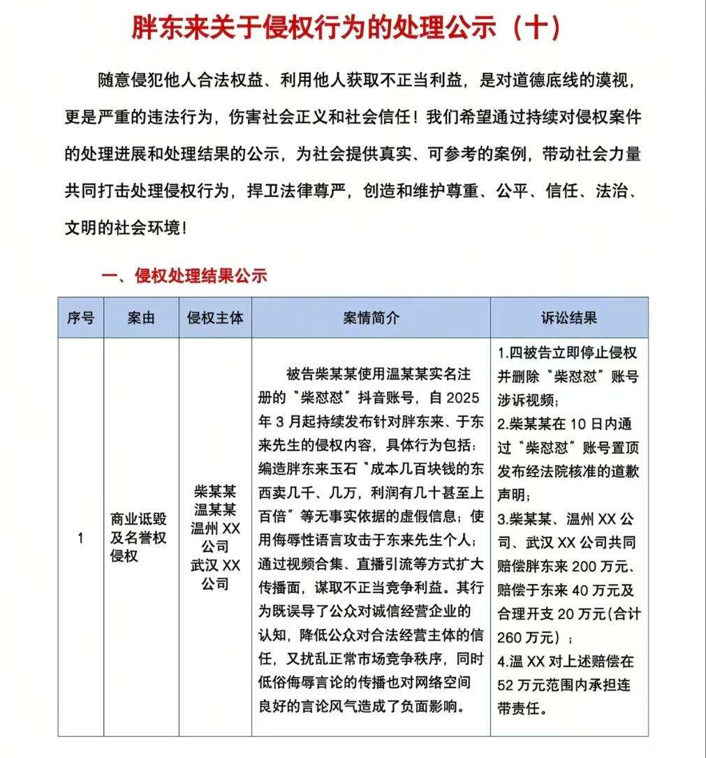 11月11日,胖东来发布关于侵权行为的诉讼结果。其中,关于柴怼怼案的诉讼结果为:柴某某、温州XX公司、武汉XX公司共同赔偿胖东来200万元、赔偿于东来40万元及合理开支20万元,合计赔偿为260万元。