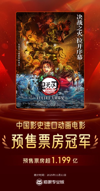 上证报中国证券网讯(记者杨翔菲)据猫眼专业版数据,截至11月11日午间,电影《鬼灭之刃:无限城篇第一章猗窝座再袭》预售总票房(含零点场)突破1.199亿元,超越《灌篮高手》,刷新中国影史进口动画电影预售票房纪录。