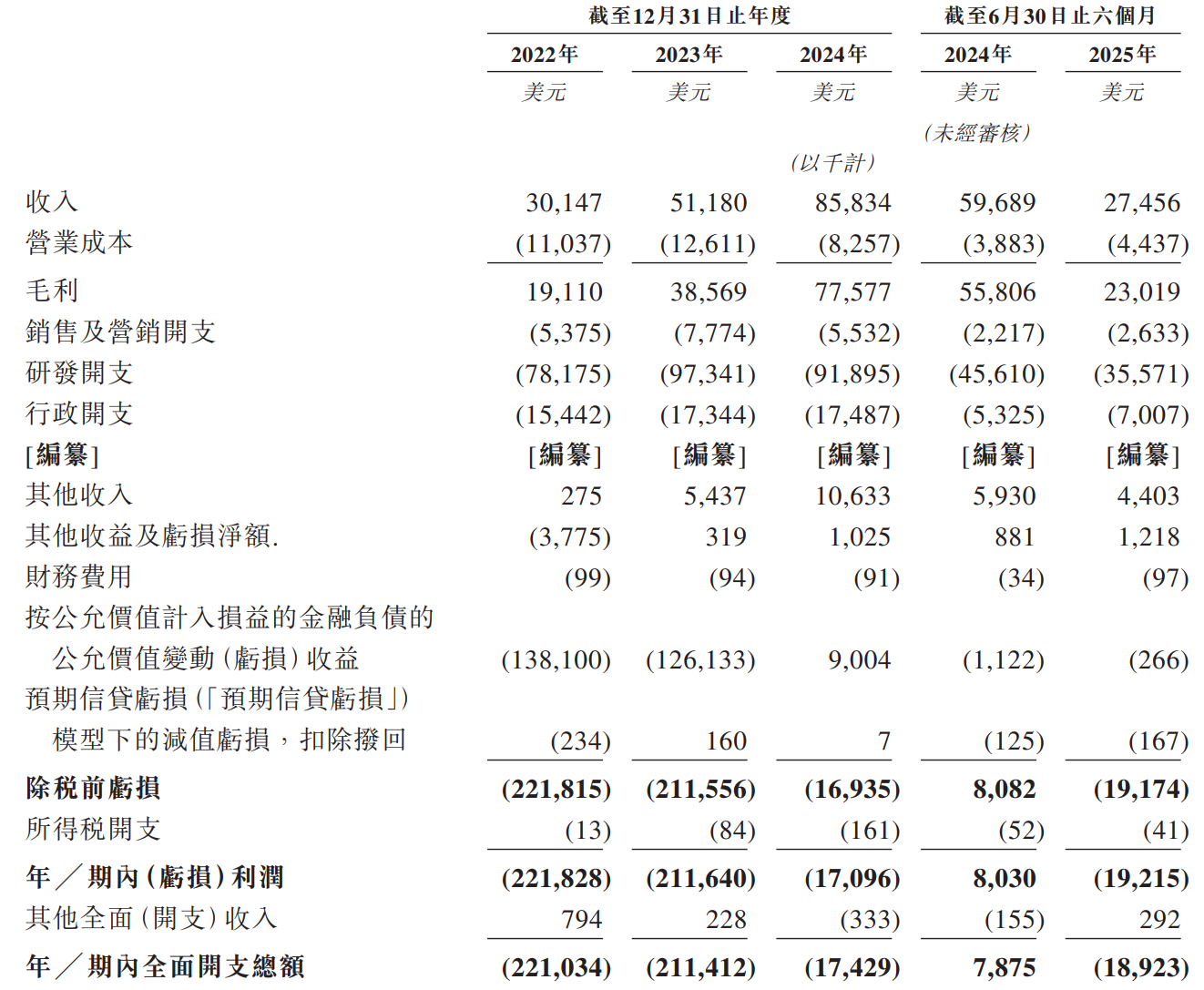 财务方面,2022年至2024年,英矽智能营收分别为3014.7万美元、5118.0万美元、8583.4万美元,整体实现较快增长;同期净亏损分别为2.22亿美元、2.12亿美元、1709.6万美元,三年累计亏损约4.5亿美元。2025年上半年,公司营收为2745.6万美元,净亏损1921.5万美元。