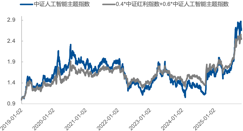 举例来看,若自2019年以来只持有中证人工智能主题指数,虽然总收益不错,但持有过程中经历的波动和回撤均较大,投资者的体验可能不太好。而如果在这里面采取40%中证红利指数、60%中证人工智能主题指数的配置方式,在收益相近的情况下,具备更小的波动与回撤,投资者也许就能体会到均衡布局带来的积极意义。