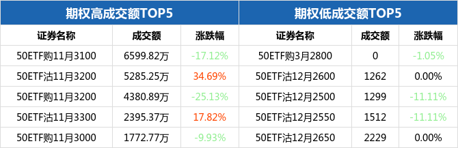 从成交额来看,50ETF期权合约中,50ETF购11月3100成交额最高,为6599.82万元,全日下跌17.12%,报收0.092元;而最低的为50ETF购3月2800,成交额为0元,全日下跌1.05%,报收0.4249元。