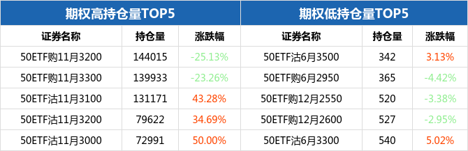 从持仓量来看,50ETF期权合约中,50ETF购11月3200持仓量最大,为144015张,期权全日下跌25.13%,报收0.0286元;持仓量最小的为50ETF沽6月3500,共计342张,期权全日上涨3.13%,报收0.3685元。