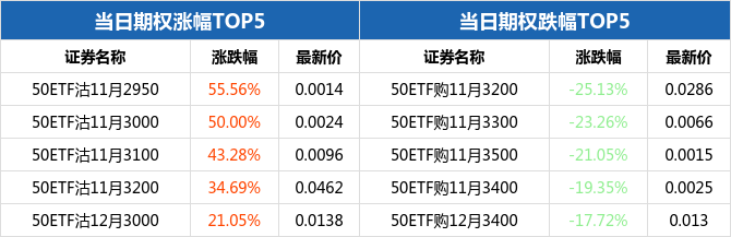 50ETF期权当日有100个合约正在交易。从涨跌幅来看,50ETF期权合约中,50ETF沽11月2950涨幅最大,为55.56%,报收0.0014元;50ETF购11月3200跌幅最大,为25.13%,报收0.0286元。
