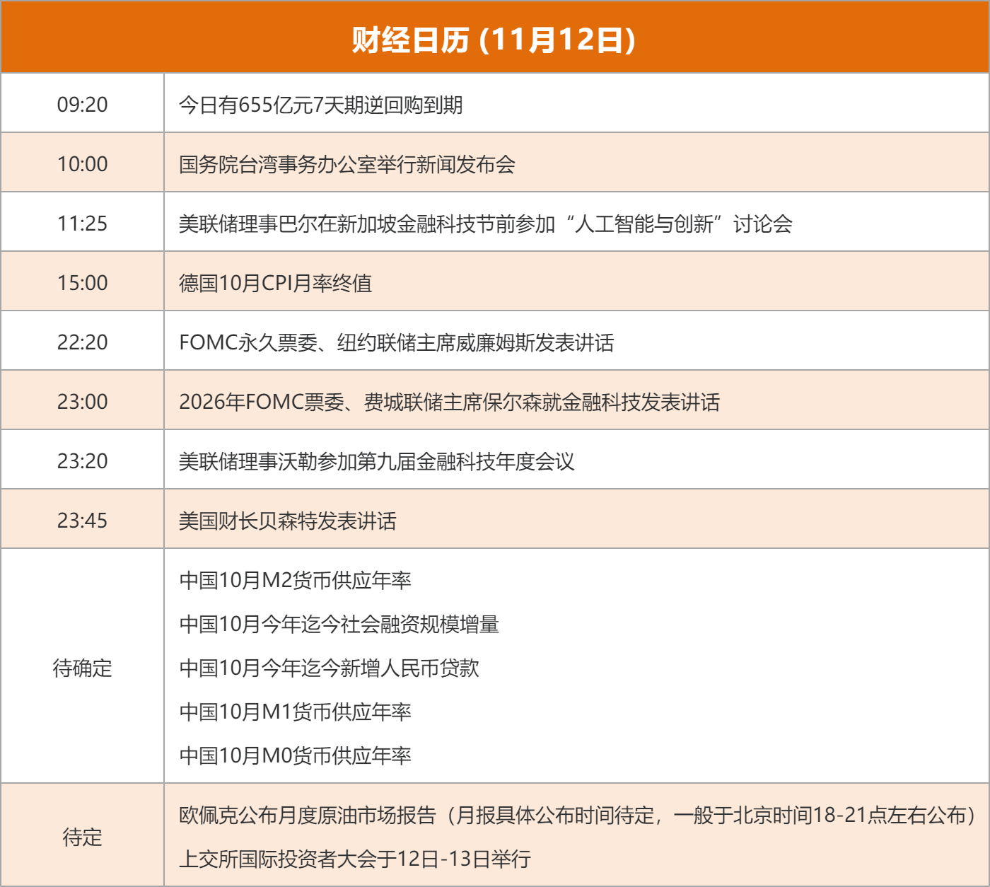 美债受每周ADP就业数据影响,美国上午时段国债期货走高,并在之后大体维持涨势,预示着国债现货市场在退伍军人节休市后重新开盘时,10年期收益率或将低开约5个基点至4.07%左右。期权市场存在着对10年期国债的上涨保护需求。在美国午后中段,曲线短端的国债期货上涨大约2个跳动点,长债与超长期国债期货上涨约15个跳动点。这种价格走势表明,周三现货市场重开时,10年期收益率或将低开约5个基点,至约4.07%;30年期收益率或将低开约3个基点至4.67%;2年期国债将小幅走强。
