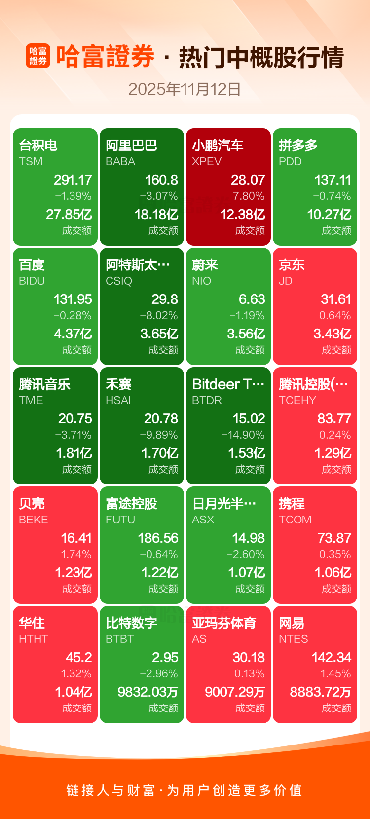台积电跌1.39%,阿里巴巴跌3.07%,小鹏汽车涨7.80%,拼多多跌0.74%,百度跌0.28%,阿特斯太阳能跌8.02%,蔚来跌1.19%,京东涨0.64%,腾讯音乐跌3.71%,禾赛跌9.89%。