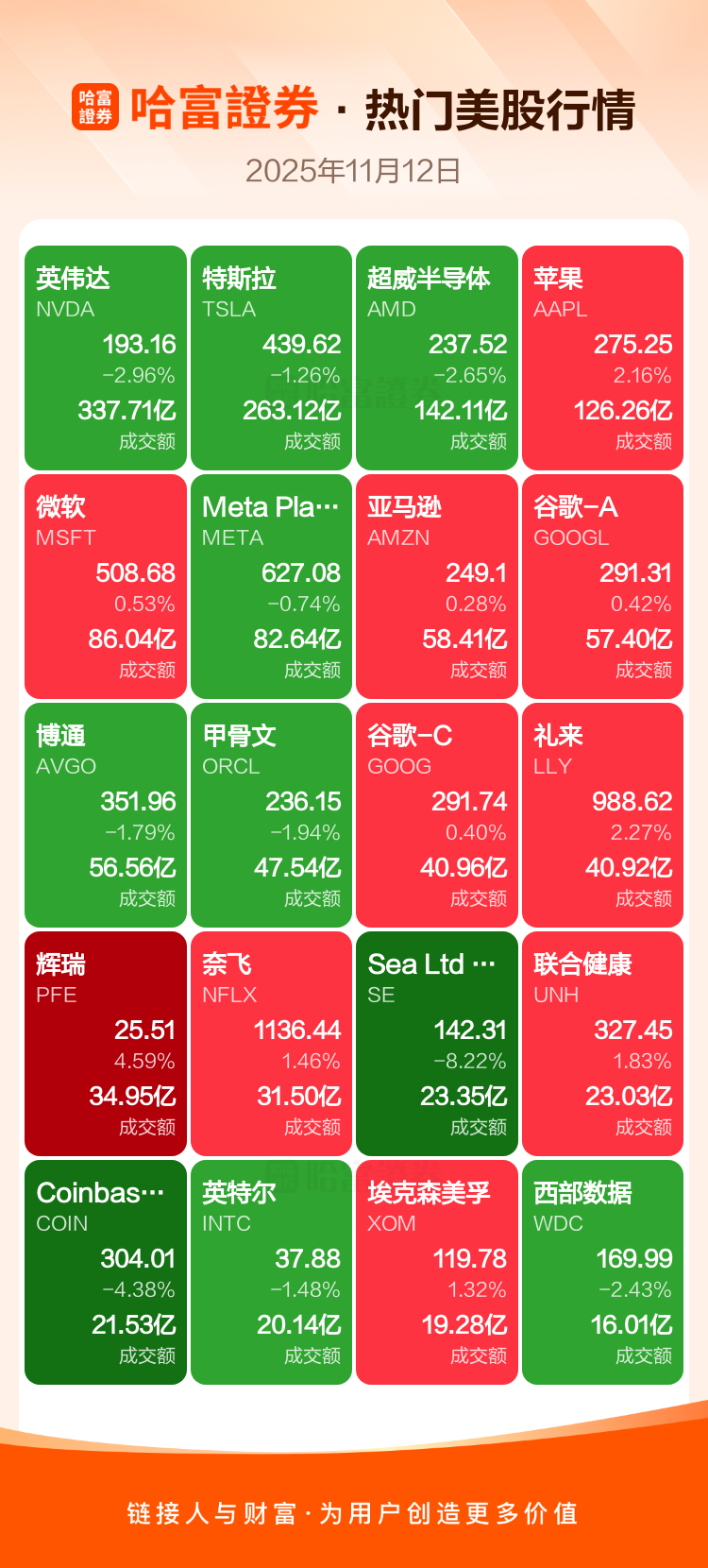 英伟达跌2.96%,特斯拉跌1.26%,超威半导体跌2.65%,苹果涨2.16%,微软涨0.53%,Meta Platforms Inc-A跌0.74%,亚马逊涨0.28%,谷歌-A涨0.42%,博通跌1.79%,甲骨文跌1.94%。