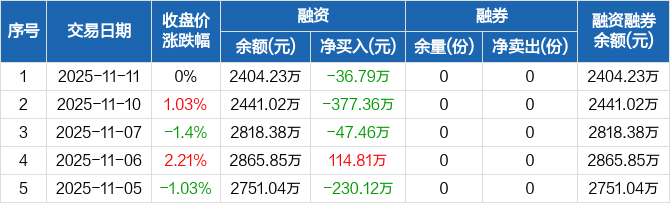 融资方面,当日融资买入734.01万元,融资偿还770.79万元,融资净偿还36.79万元,连续3日净偿还累计461.62万元。融券方面,融券卖出0份,融券偿还0份,融券余量0份,融券余额0元。融资融券余额合计2404.23万元。