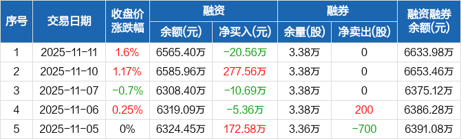 铭利达:融资净偿还20.56万元,融资余额6565.4万元(11-11)