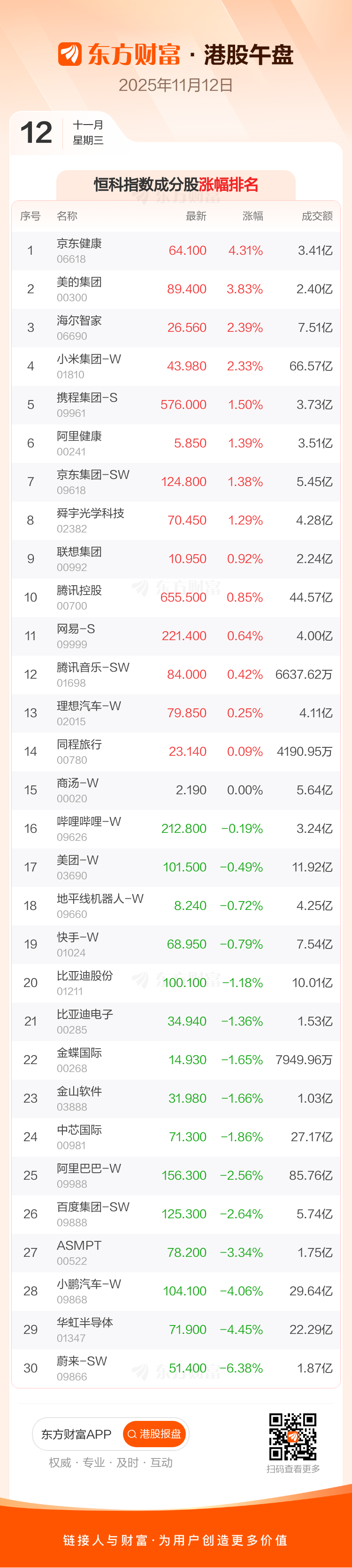 11月12日港股午盘:恒指涨0.62% 华润万象生活领涨成分股