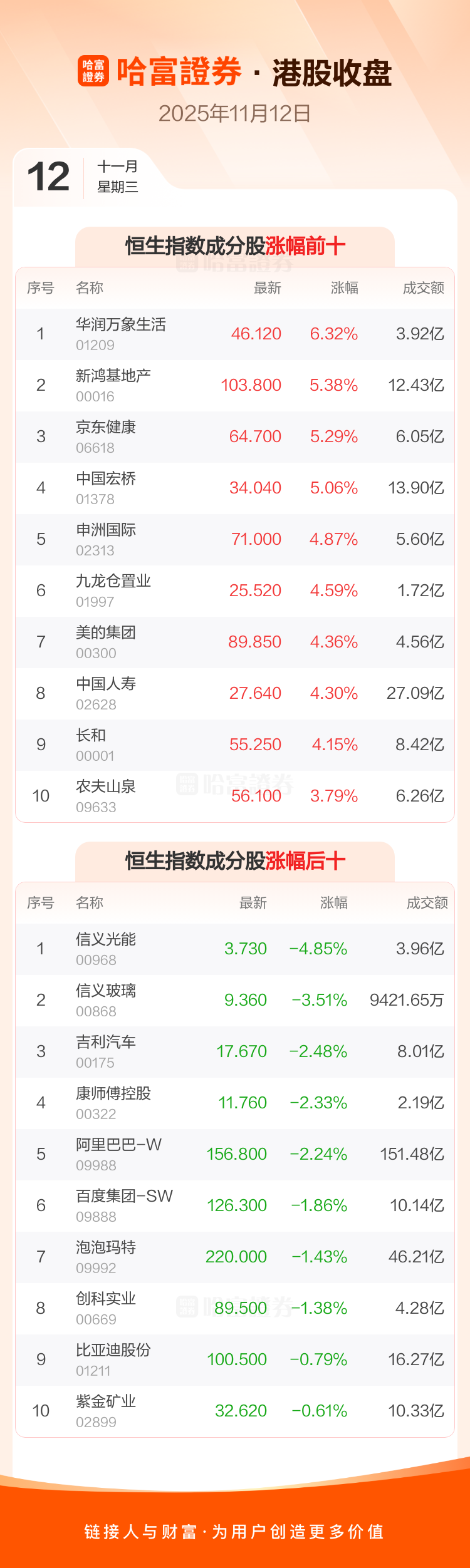 港股收盘:恒指涨0.85% 华润万象生活领涨成分股