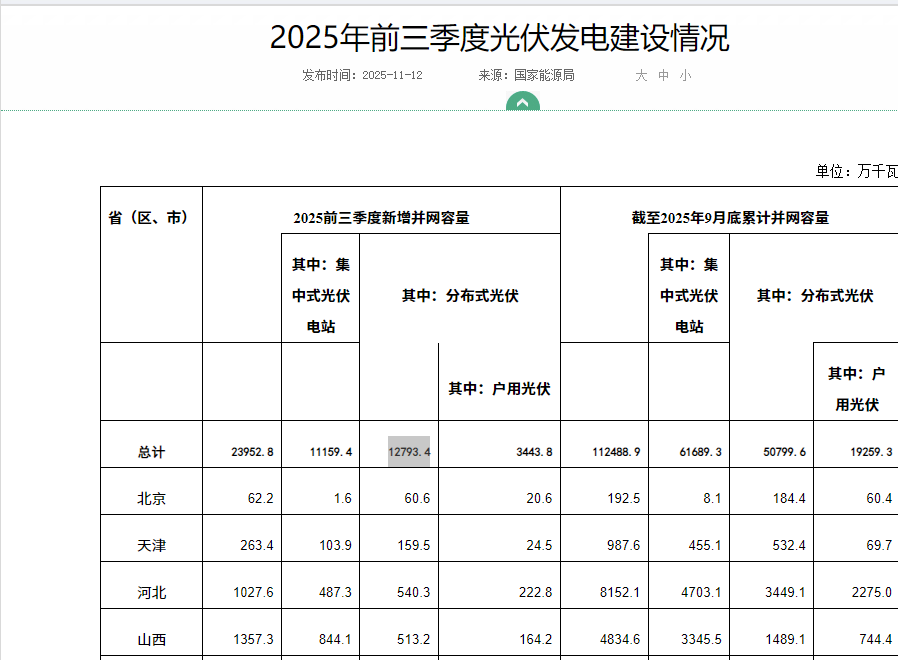 国家能源局称,2025前三季度光伏发电新增并网容量23952.8万千瓦,其中集中式光伏电站11159.4万千瓦,分布式光伏12793.4万千瓦。