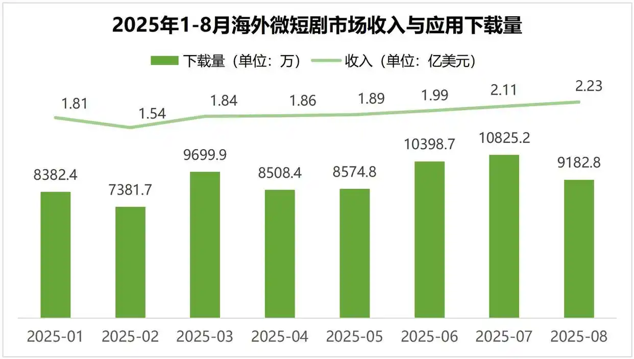 《白皮书》分析,随着海外市场竞争升级,“抱团出海”已成中国微短剧“走出去”的必然选择。2025年1—8月,海外微短剧市场总收入达15.25亿美元(折算为人民币约108.38亿元),同比增长194.9%;海外微短剧应用总下载量约7.3亿次,同比增长370.4%;中国企业占主导地位,通过产业联盟、资源共享等方式,持续扩大中国微短剧影响力。