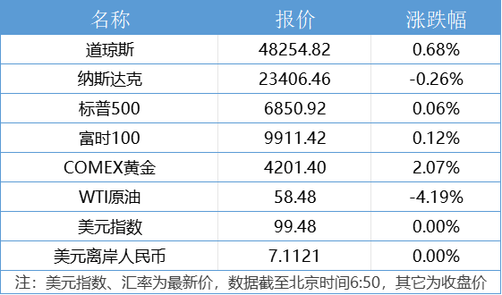 1、美国三大股指收盘涨跌不一,道指涨0.68%报482254.82点,续创收盘新高,标普500指数涨0.06%报6850.92点,纳指跌0.26%报23406.46点。高盛集团、联合健康集团涨超3%,领涨道指。万得美国科技七巨头指数跌0.8%,脸书跌近3%,特斯拉跌逾2%。中概股多数下跌,大全新能源跌近10%,腾讯音乐跌超8%。